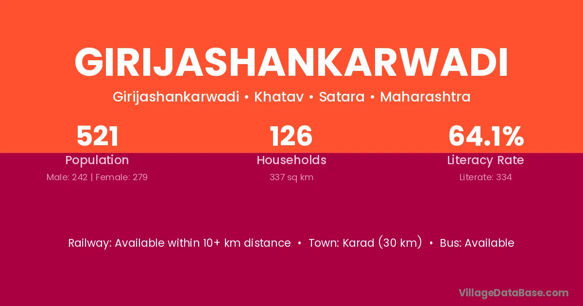 Karad (30 km) is the nearest town to Girijashankarwadi village for major economic activities and is located approximately 30 km away.