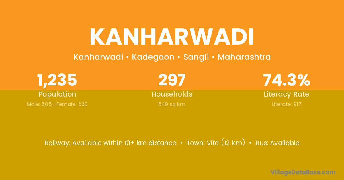 Vita (42 km) is the nearest town to Kanharwadi village for major economic activities and is located approximately 42 km away.