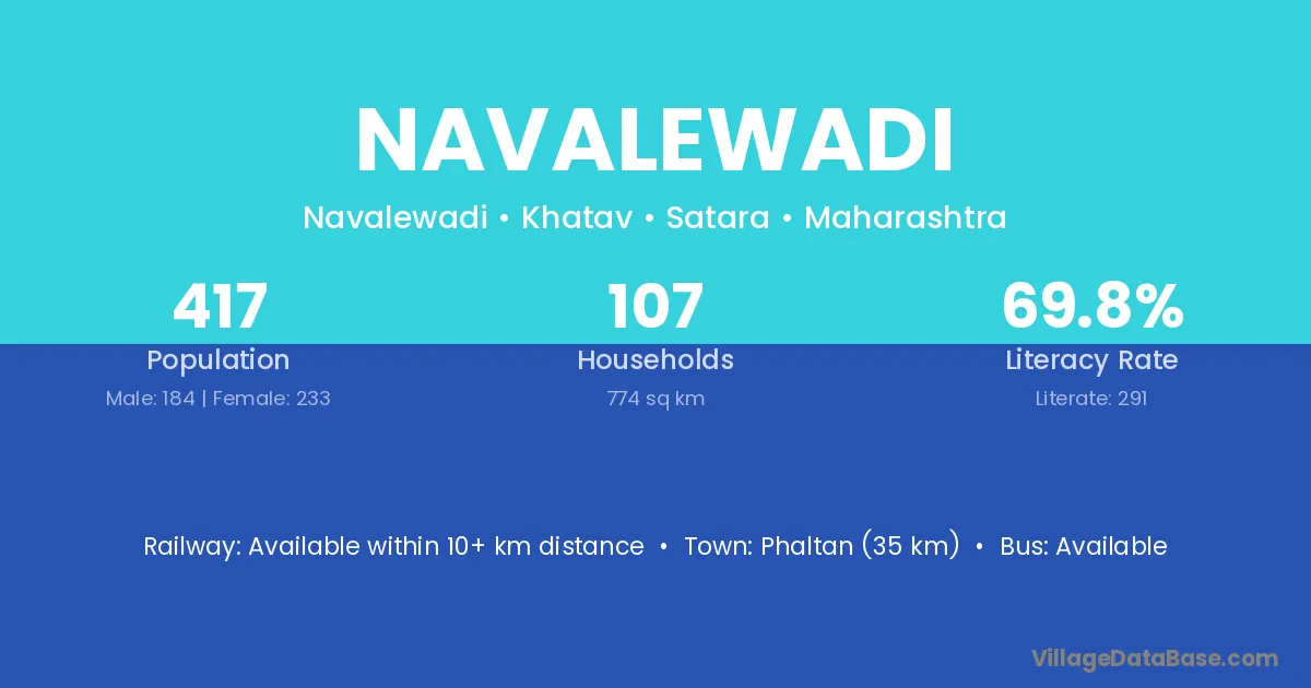 Navalewadi village has a total population of 417 people, of which 184 are males and 233 are females.