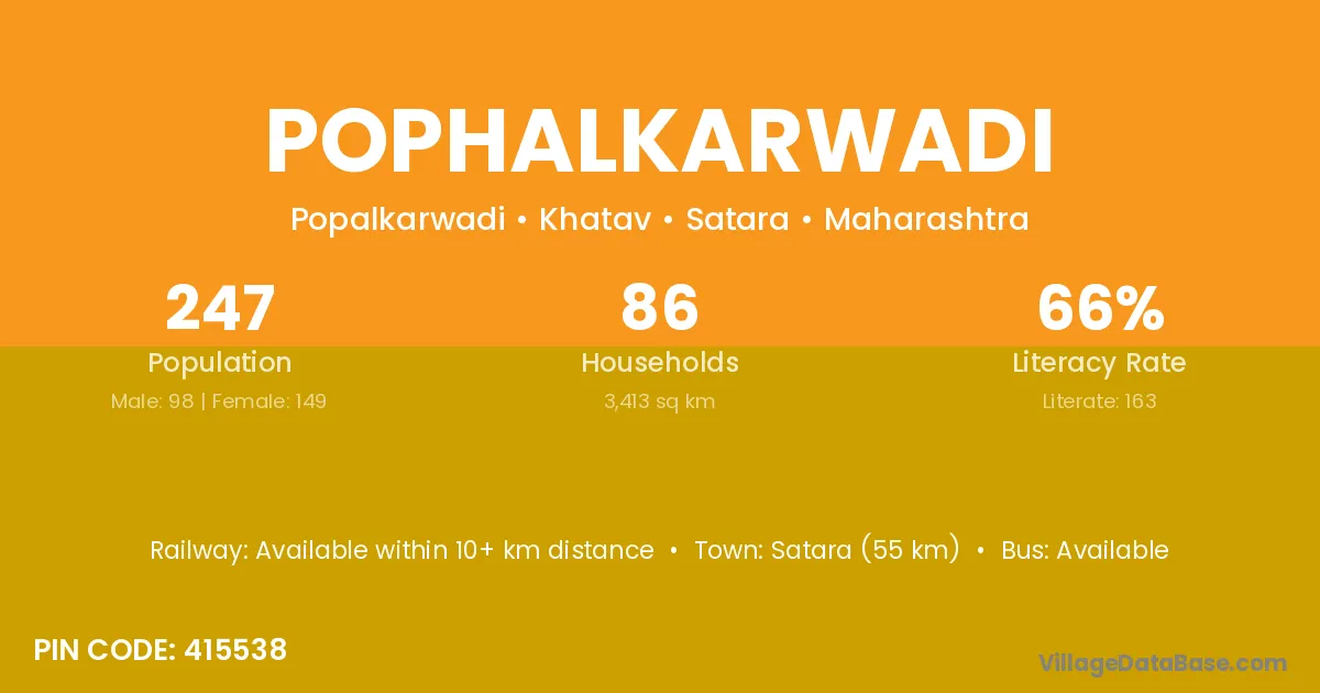 Satara (55 km) is the nearest town to Pophalkarwadi village for major economic activities and is located approximately 55 km away.