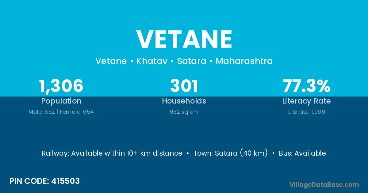 Satara (40 km) is the nearest town to Vetane village for major economic activities and is located approximately 40 km away.