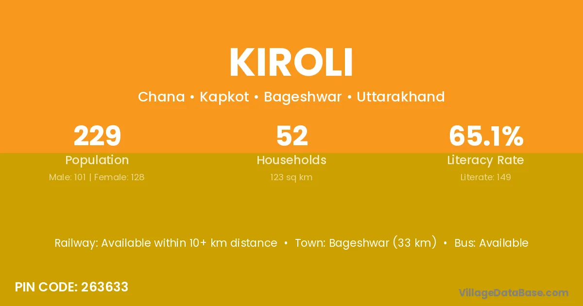 The literacy rate of Kiroli village is 77.69%. Male literacy stands at 82.01% and female literacy at 73.18%.