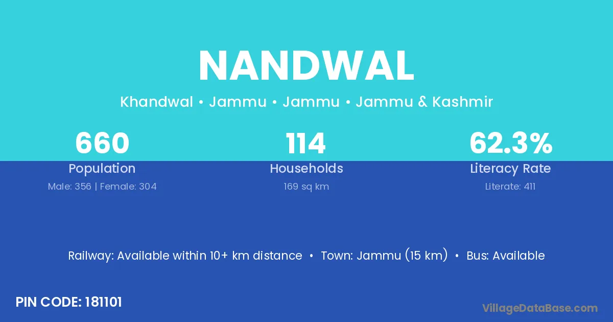 Nandwal village has a total population of 2,362 people, of which 1,205 are males and 1,157 are females.
