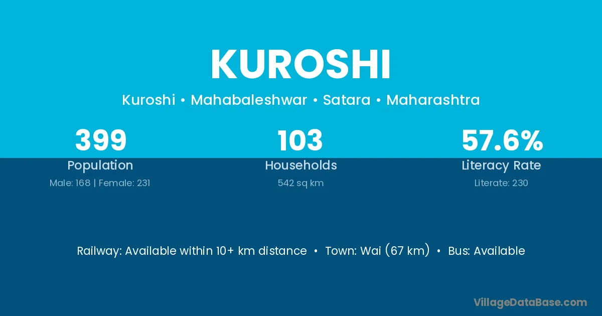Kuroshi village has a total population of 399 people, of which 168 are males and 231 are females.