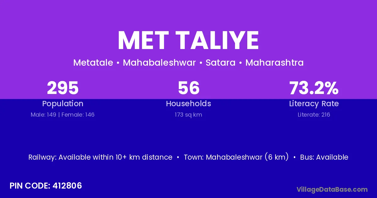Mahabaleshwar (6 km) is the nearest town to Met Taliye village for major economic activities and is located approximately 6 km away.