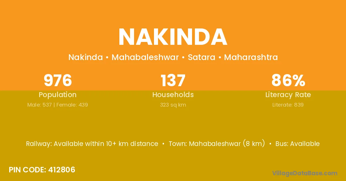 Mahabaleshwar (8 km) is the nearest town to Nakinda village for major economic activities and is located approximately 8 km away.
