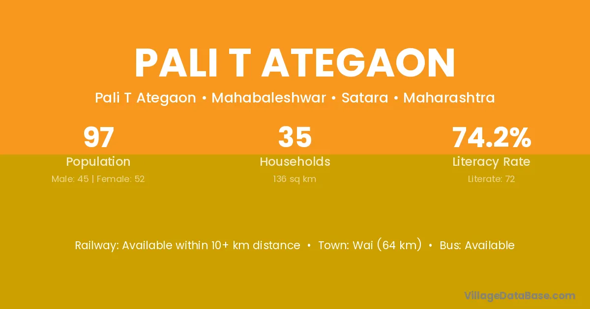 Pali T Ategaon village has a total population of 97 people, of which 45 are males and 52 are females.