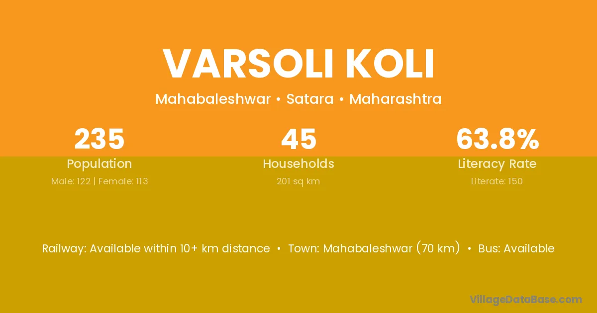 Mahabaleshwar (70 km) is the nearest town to Varsoli Koli village for major economic activities and is located approximately 70 km away.