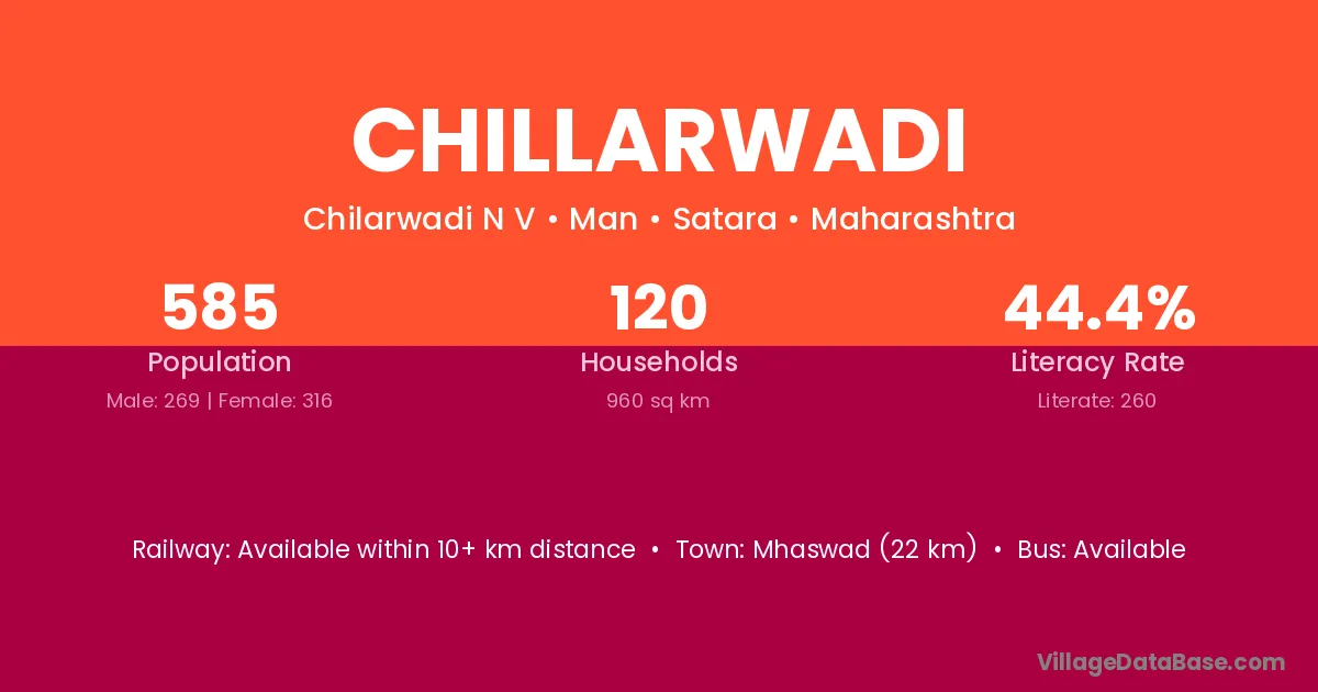Chillarwadi village has a total population of 585 people, of which 269 are males and 316 are females.