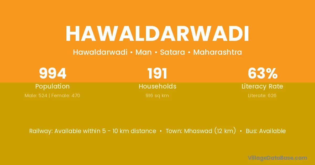 Mhaswad (12 km) is the nearest town to Hawaldarwadi village for major economic activities and is located approximately 12 km away.