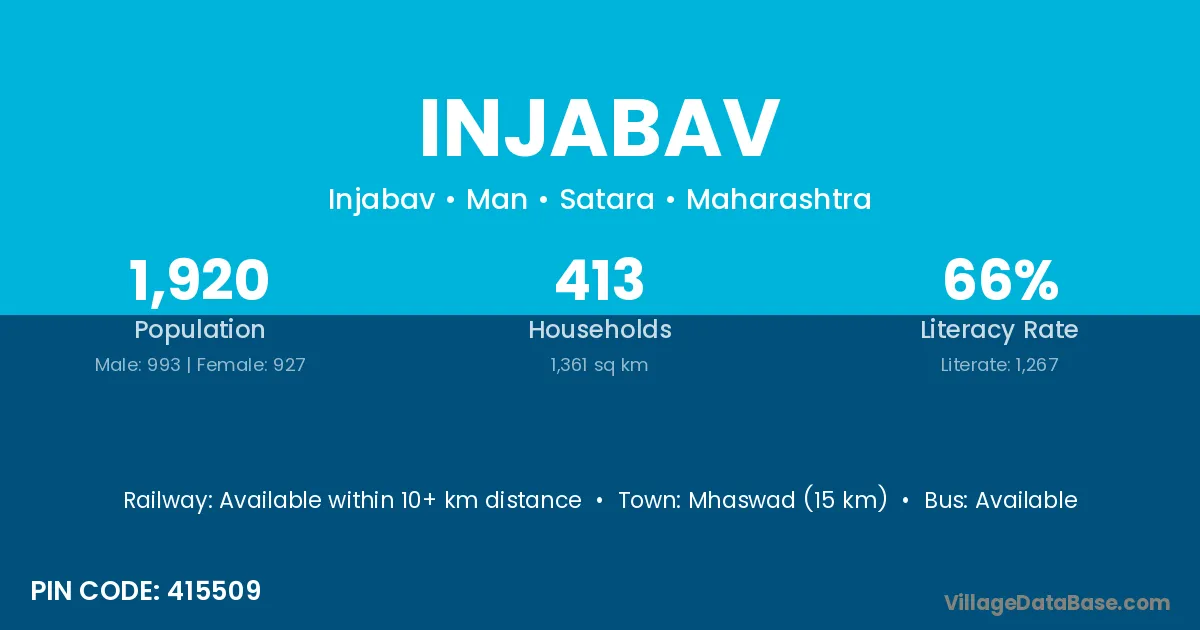 Mhaswad (15 km) is the nearest town to Injabav village for major economic activities and is located approximately 15 km away.