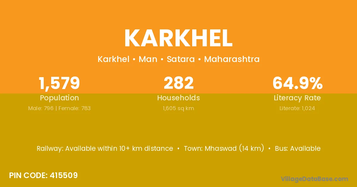 Mhaswad (14 km) is the nearest town to Karkhel village for major economic activities and is located approximately 14 km away.