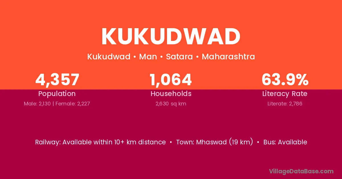 Mhaswad (19 km) is the nearest town to Kukudwad village for major economic activities and is located approximately 19 km away.