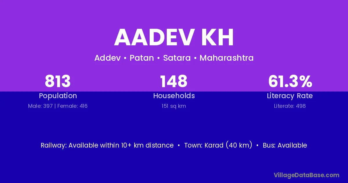 Karad (40 km) is the nearest town to Aadev Kh village for major economic activities and is located approximately 40 km away.