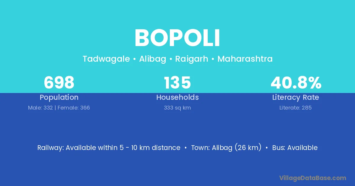 The literacy rate of Bopoli village is 68.71%. Male literacy stands at 81.02% and female literacy at 56.96%.