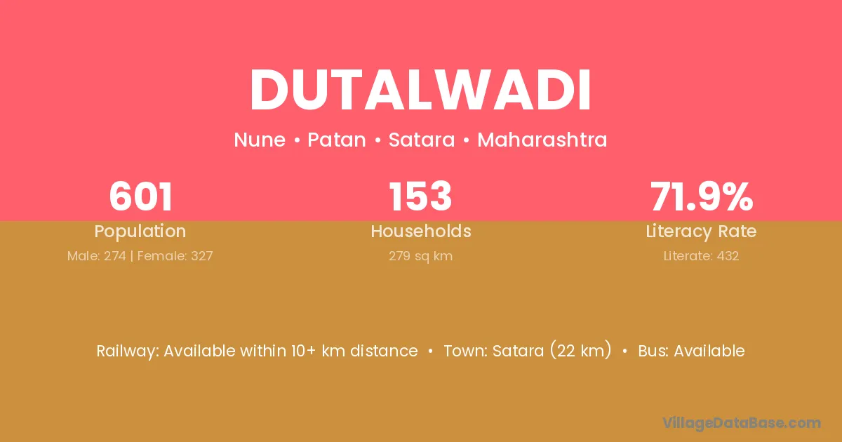Satara (22 km) is the nearest town to Dutalwadi village for major economic activities and is located approximately 22 km away.
