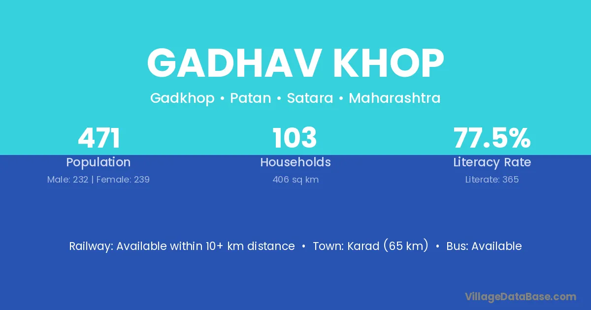 Karad (65 km) is the nearest town to Gadhav Khop village for major economic activities and is located approximately 65 km away.