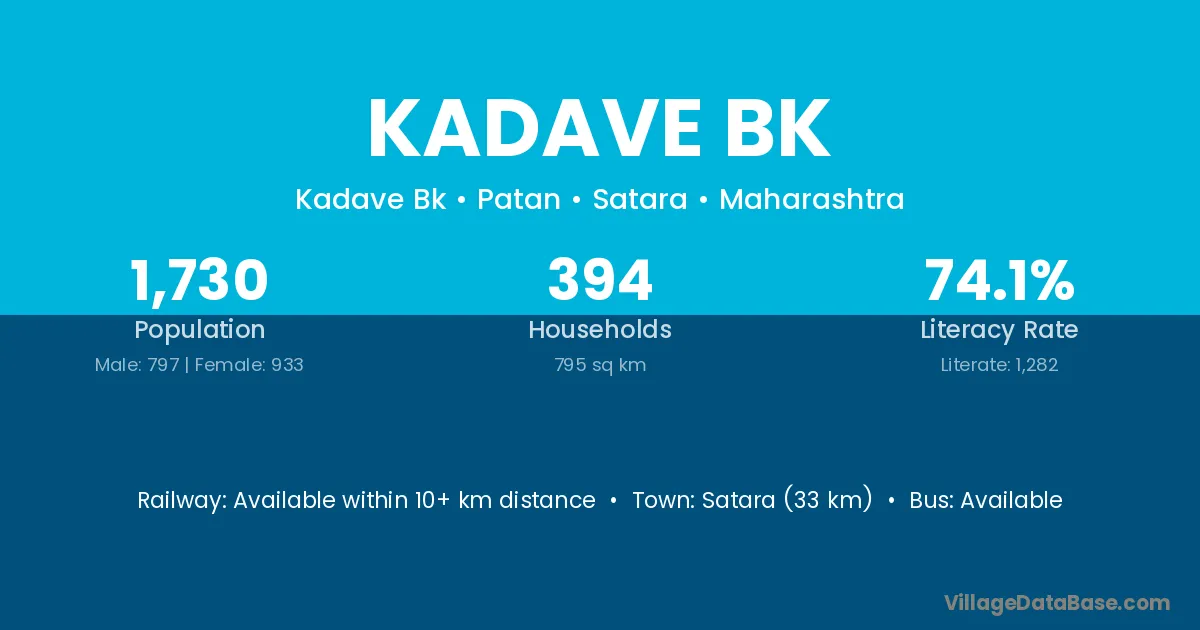 Satara (33 km) is the nearest town to Kadave Bk village for major economic activities and is located approximately 33 km away.