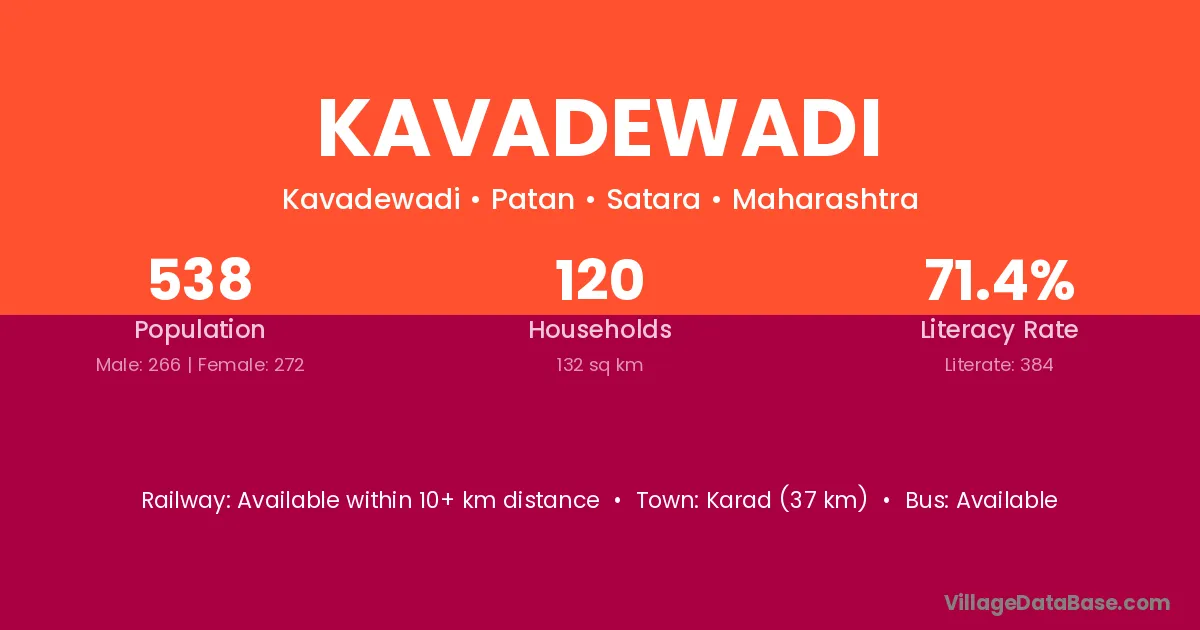 Karad (37 km) is the nearest town to Kavadewadi village for major economic activities and is located approximately 37 km away.