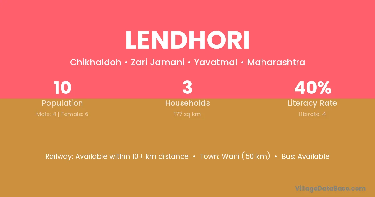 The literacy rate of Lendhori village is 62.97%. Male literacy stands at 73.45% and female literacy at 52.38%.
