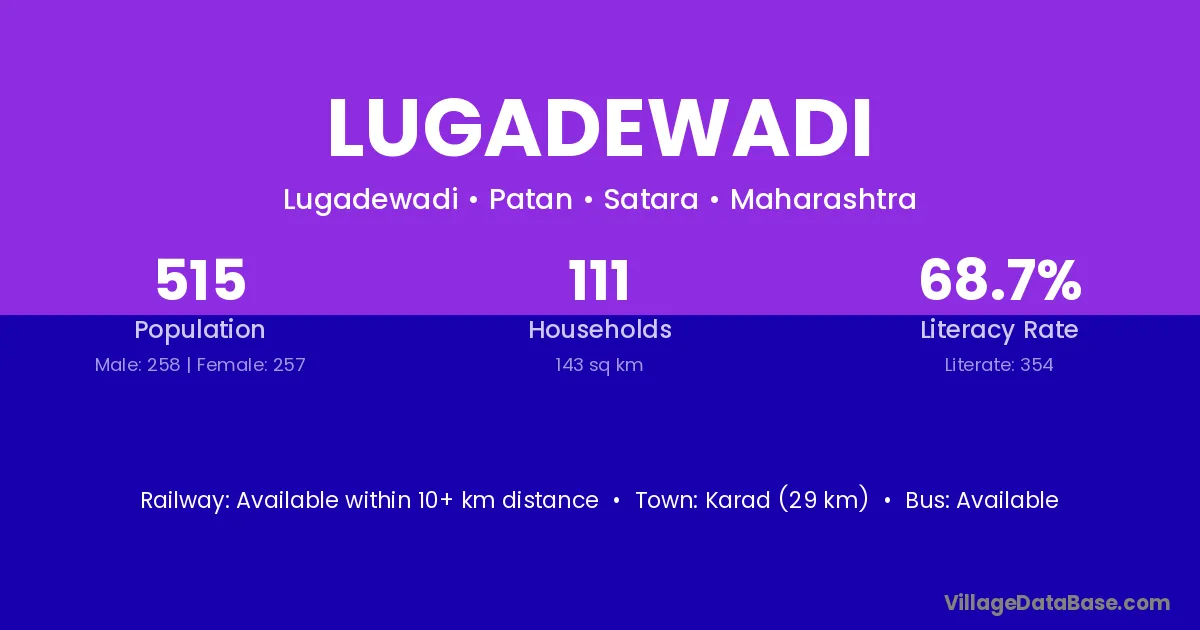 Lugadewadi village has a total population of 515 people, of which 258 are males and 257 are females.