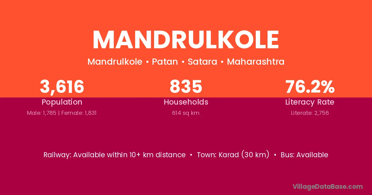 Karad (30 km) is the nearest town to Mandrulkole village for major economic activities and is located approximately 30 km away.