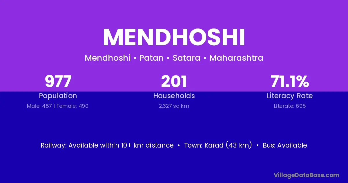 Karad (43 km) is the nearest town to Mendhoshi village for major economic activities and is located approximately 43 km away.