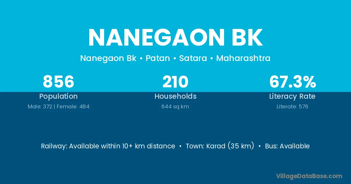 Karad (35 km) is the nearest town to Nanegaon Bk village for major economic activities and is located approximately 35 km away.