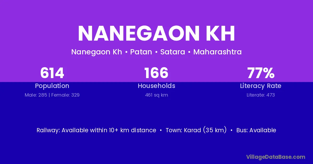 Karad (35 km) is the nearest town to Nanegaon Kh village for major economic activities and is located approximately 35 km away.