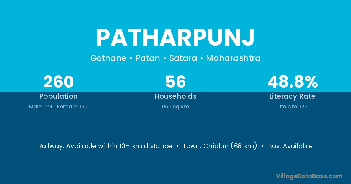 Chiplun (68 km) is the nearest town to Patharpunj village for major economic activities and is located approximately 68 km away.