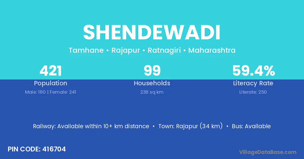 The literacy rate of Shendewadi village is 70.74%. Male literacy stands at 80.07% and female literacy at 62.27%.