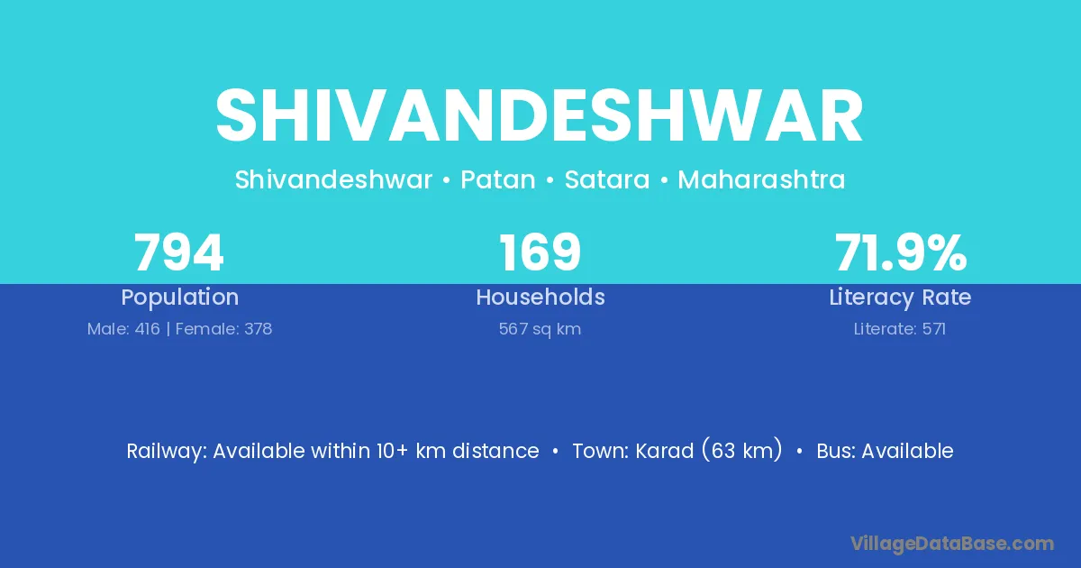 Karad (63 km) is the nearest town to Shivandeshwar village for major economic activities and is located approximately 63 km away.