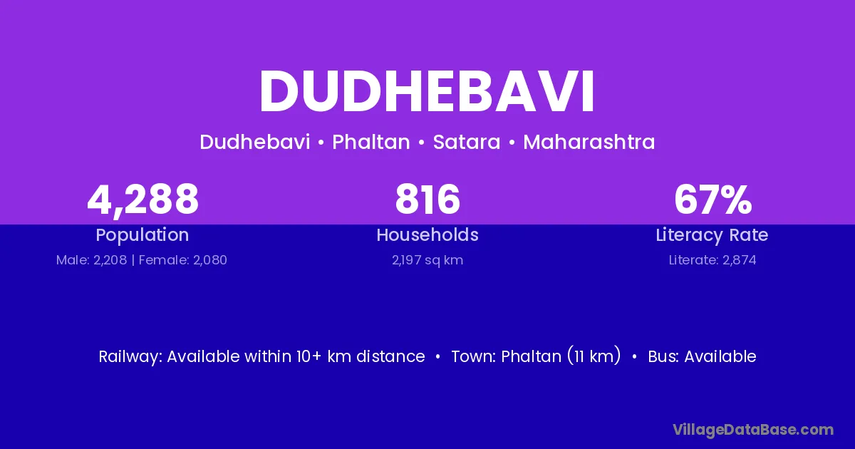 Phaltan (11 km) is the nearest town to Dudhebavi village for major economic activities and is located approximately 11 km away.