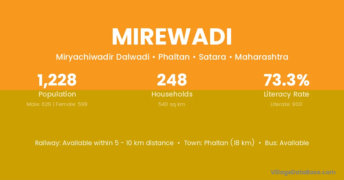 Phaltan (18 km) is the nearest town to Mirewadi village for major economic activities and is located approximately 18 km away.