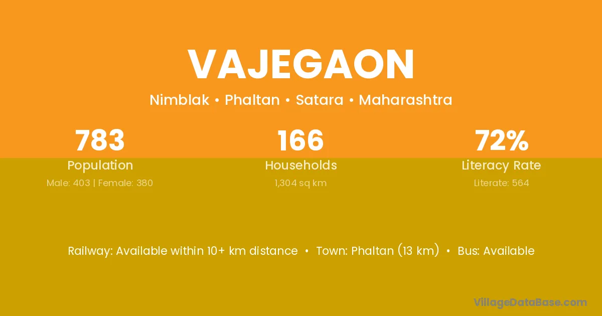 Phaltan (13 km) is the nearest town to Vajegaon village for major economic activities and is located approximately 13 km away.
