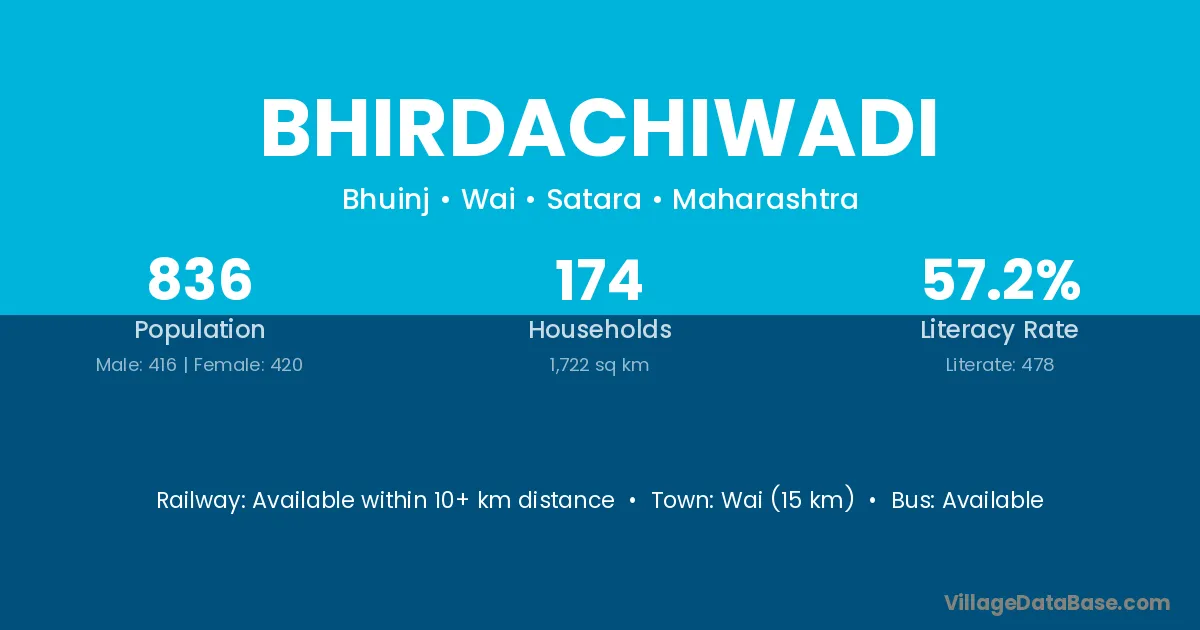 Wai (15 km) is the nearest town to Bhirdachiwadi village for major economic activities and is located approximately 15 km away.