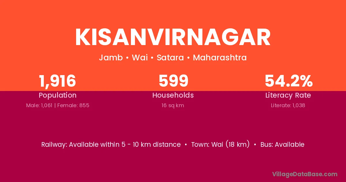 Wai (18 km) is the nearest town to Kisanvirnagar village for major economic activities and is located approximately 18 km away.
