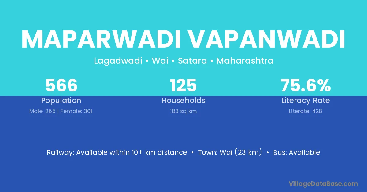 Wai (23 km) is the nearest town to Maparwadi Vapanwadi village for major economic activities and is located approximately 23 km away.