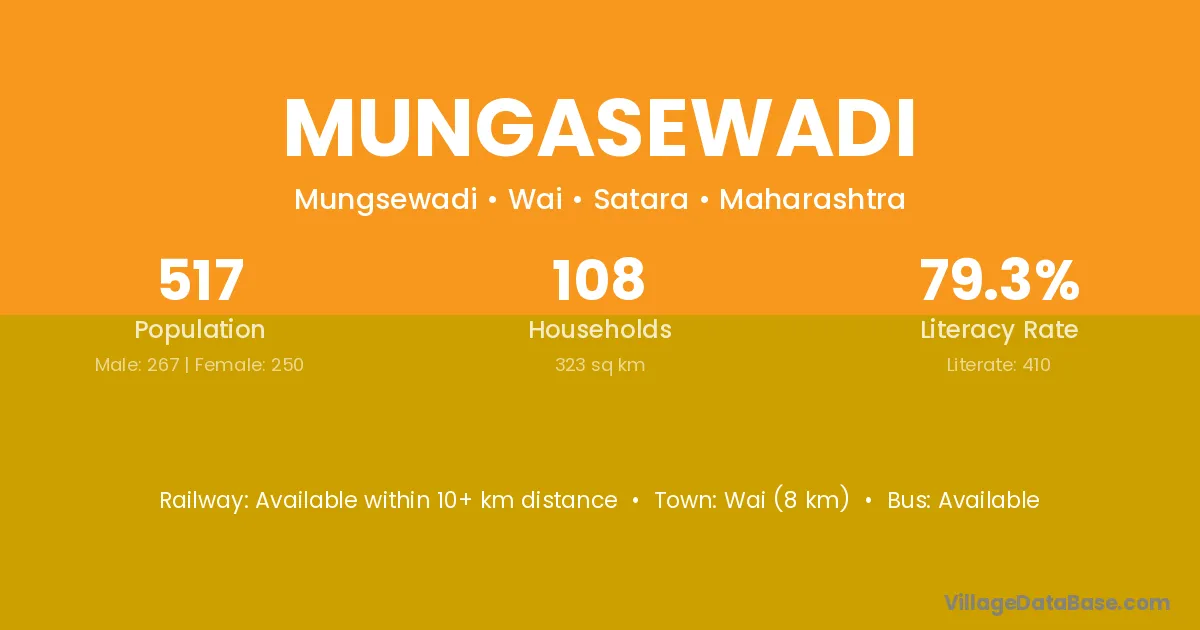Wai (8 km) is the nearest town to Mungasewadi village for major economic activities and is located approximately 8 km away.