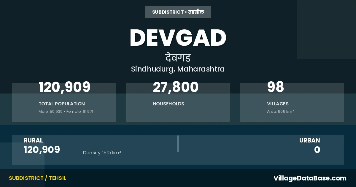 According to the 2011 census The total area of Devgad Tehsil is 808 km², with a population of 120909 people. The population density is 150 inhabitants per square kilometre, and there are approximately 27800 houses in the sub district.