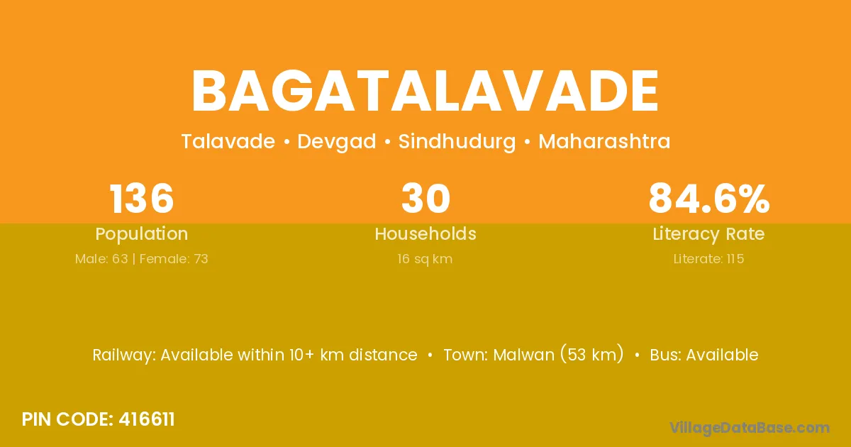 Malwan (53 km) is the nearest town to Bagatalavade village for major economic activities and is located approximately 53 km away.