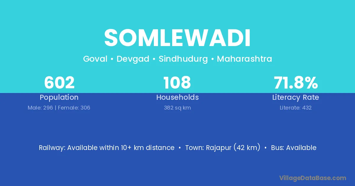 Somlewadi village has a total population of 602 people, of which 296 are males and 306 are females.