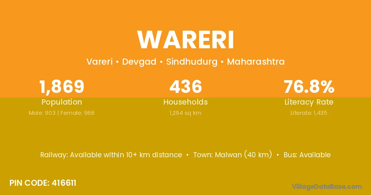 Malwan (40 km) is the nearest town to Wareri village for major economic activities and is located approximately 40 km away.