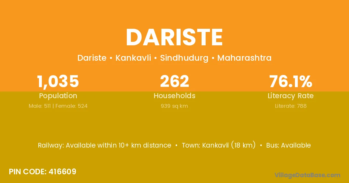 Kankavli (18 km) is the nearest town to Dariste village for major economic activities and is located approximately 18 km away.
