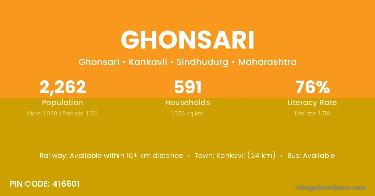 Kankavli (24 km) is the nearest town to Ghonsari village for major economic activities and is located approximately 24 km away.