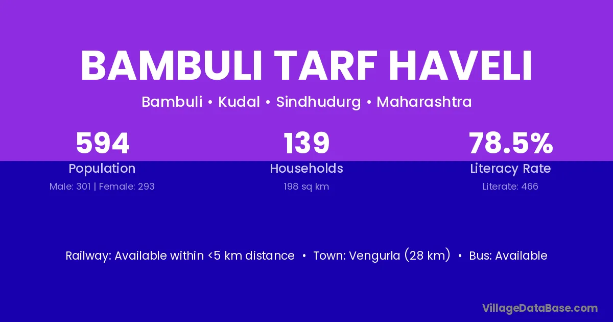 Vengurla (28 km) is the nearest town to Bambuli Tarf Haveli village for major economic activities and is located approximately 28 km away.