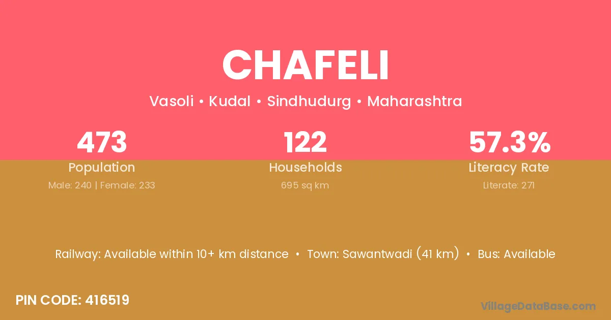 Sawantwadi (41 km) is the nearest town to Chafeli village for major economic activities and is located approximately 41 km away.