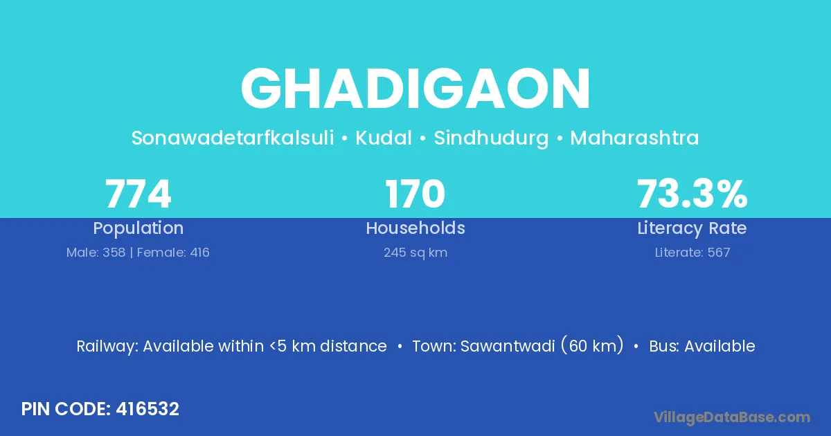 Sawantwadi (60 km) is the nearest town to Ghadigaon village for major economic activities and is located approximately 60 km away.