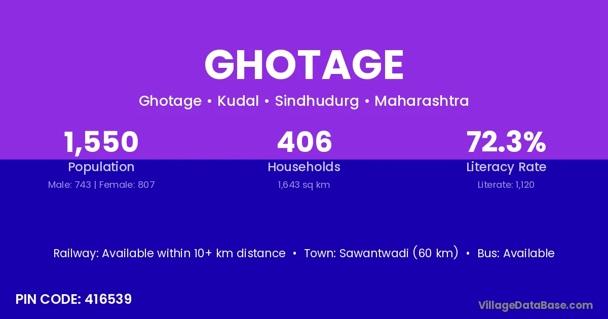 Sawantwadi (60 km) is the nearest town to Ghotage village for major economic activities and is located approximately 60 km away.
