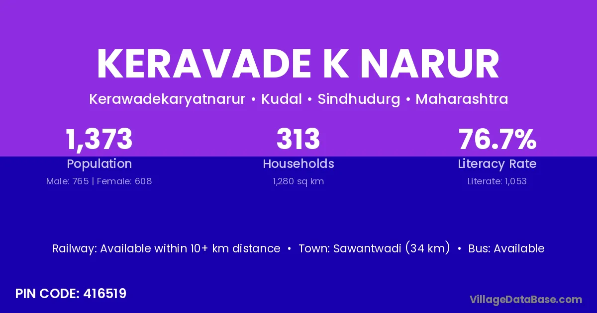 Sawantwadi (34 km) is the nearest town to Keravade K Narur village for major economic activities and is located approximately 34 km away.
